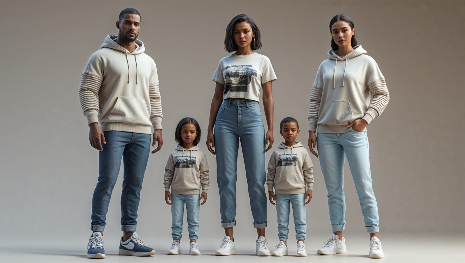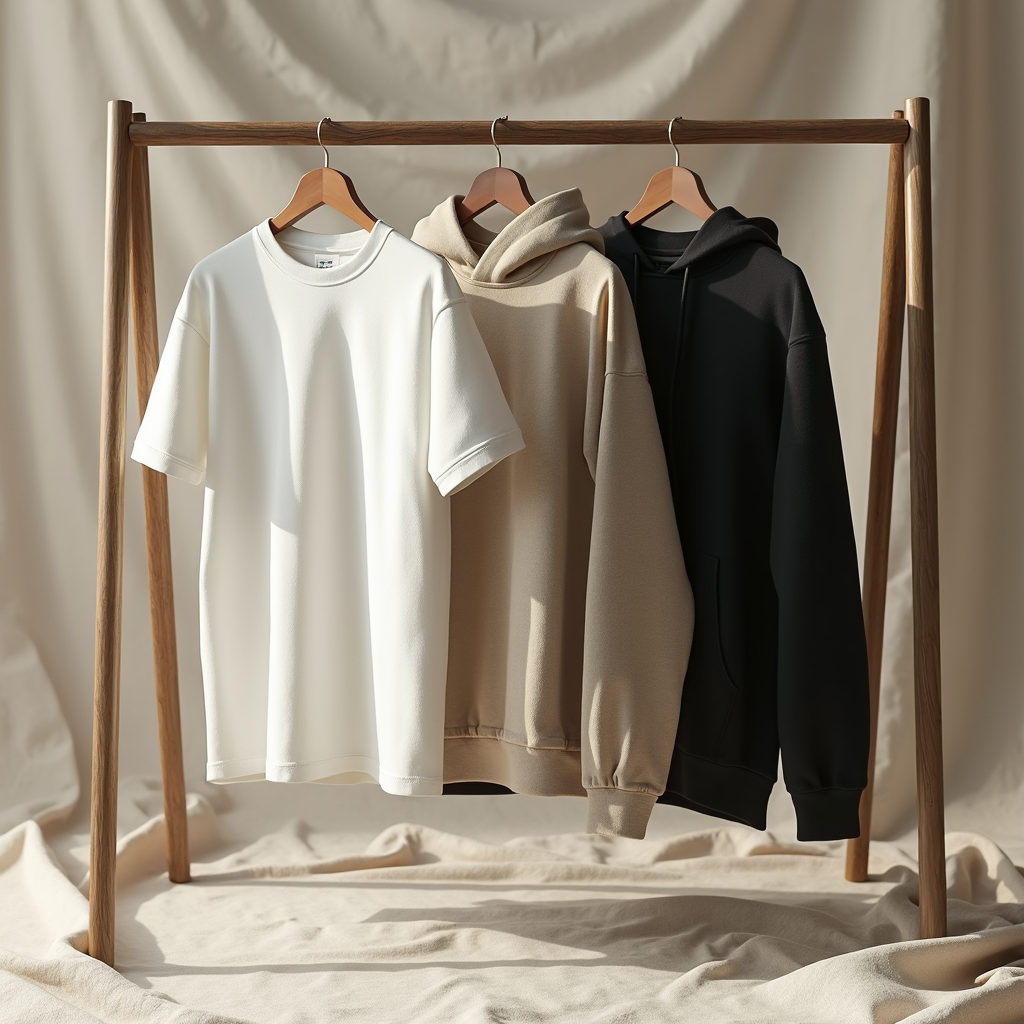 A collection of plain, high-quality T-shirts and hoodies in neutral tones.