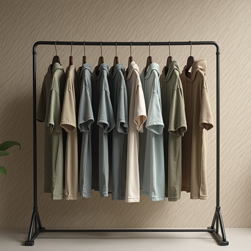 A selection of T-shirts and hoodies in earthy and pastel tones for a clean, muted aesthetic.