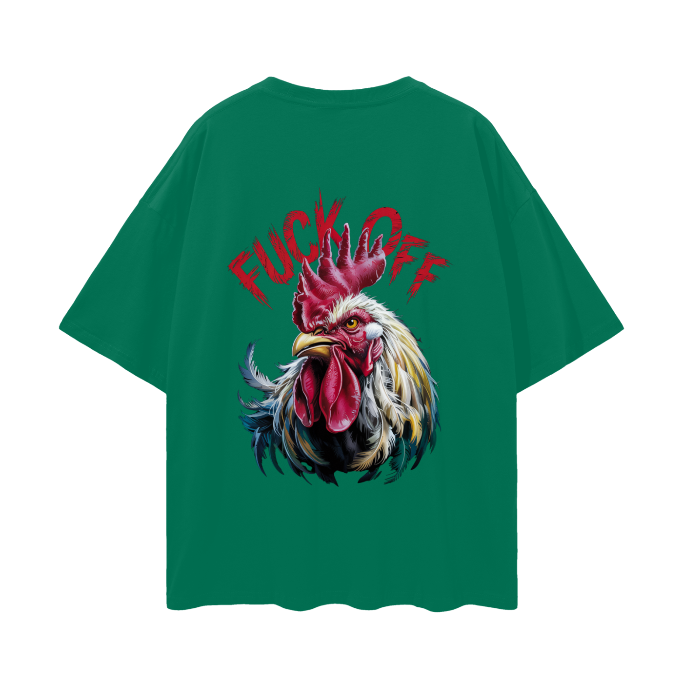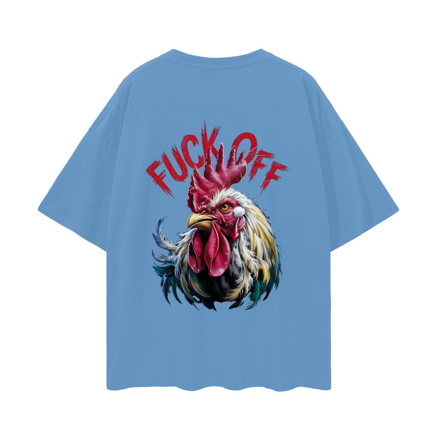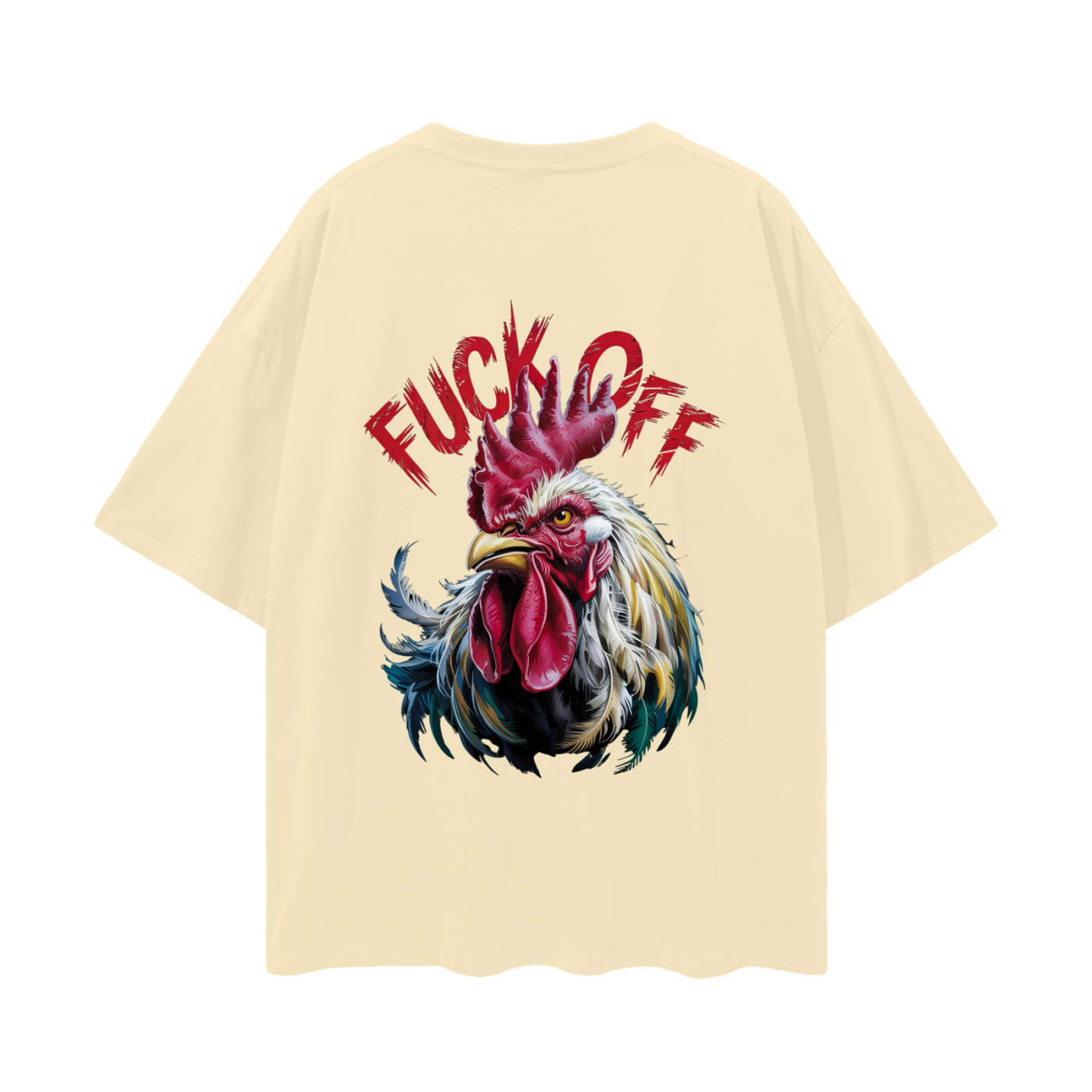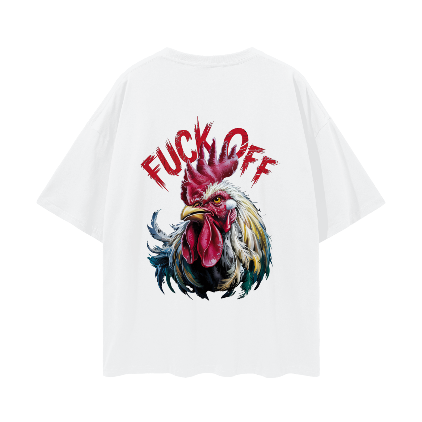 Make a statement with our Rebellious Rooster Oversized Tee. The back of this t-shirt features a striking and detailed illustration of a defiant rooster. With its sharp gaze and vibrant plumage in shades of red, yellow, white, and blue, the rooster exudes a strong and unapologetic attitude. Adding to the boldness of the design, the phrase “FUCK OFF” is emblazoned above the rooster in a distressed red lettering, making this tee a powerful expression of individuality and not taking any nonsense.