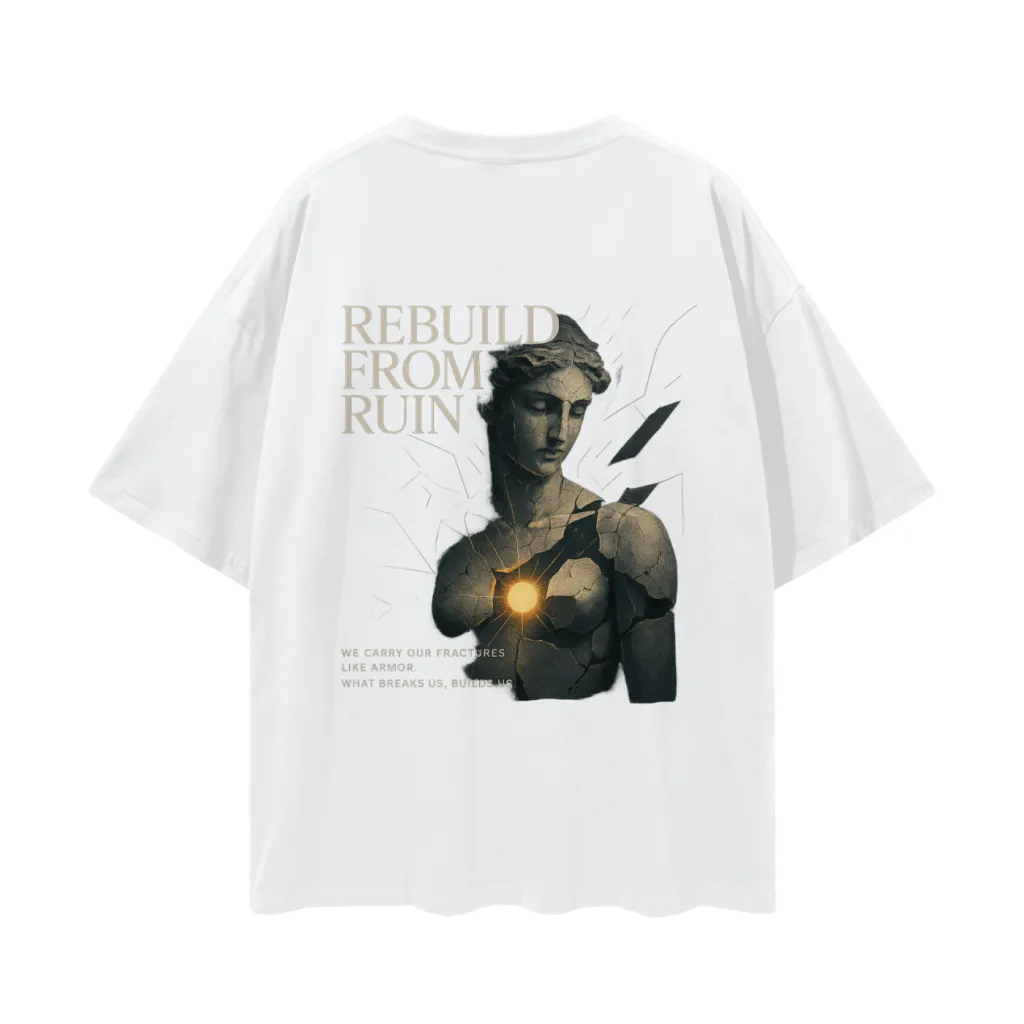 A timeless marble figure appears cracked and weathered, yet a glowing core radiates from her chest. Broken shards drift upward beside the words “Rebuild from Ruin,” underscoring the idea that every fracture can forge new armor. Below, a brief inscription reads: We carry our fractures like armor. What breaks us, builds us. Wear it as a reminder that renewal often rises from the rubble.