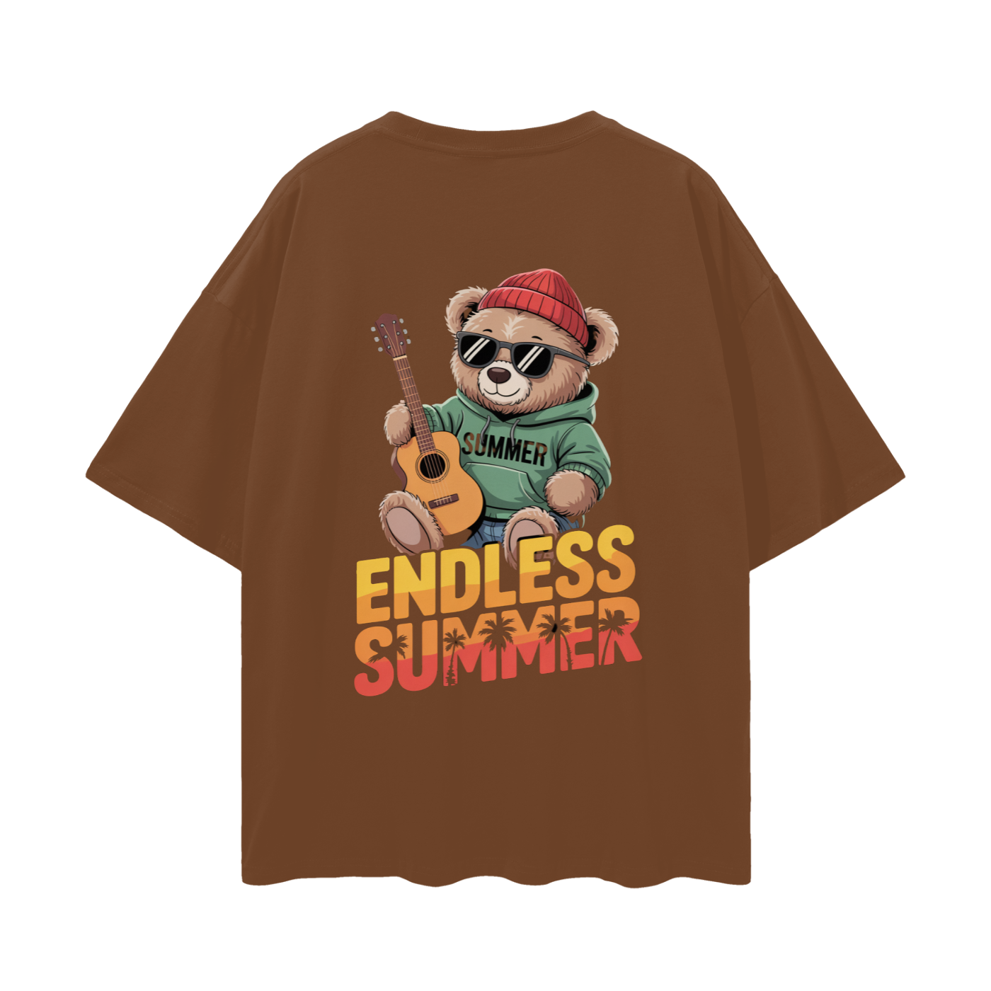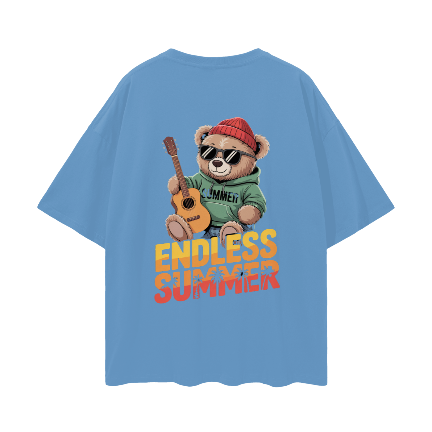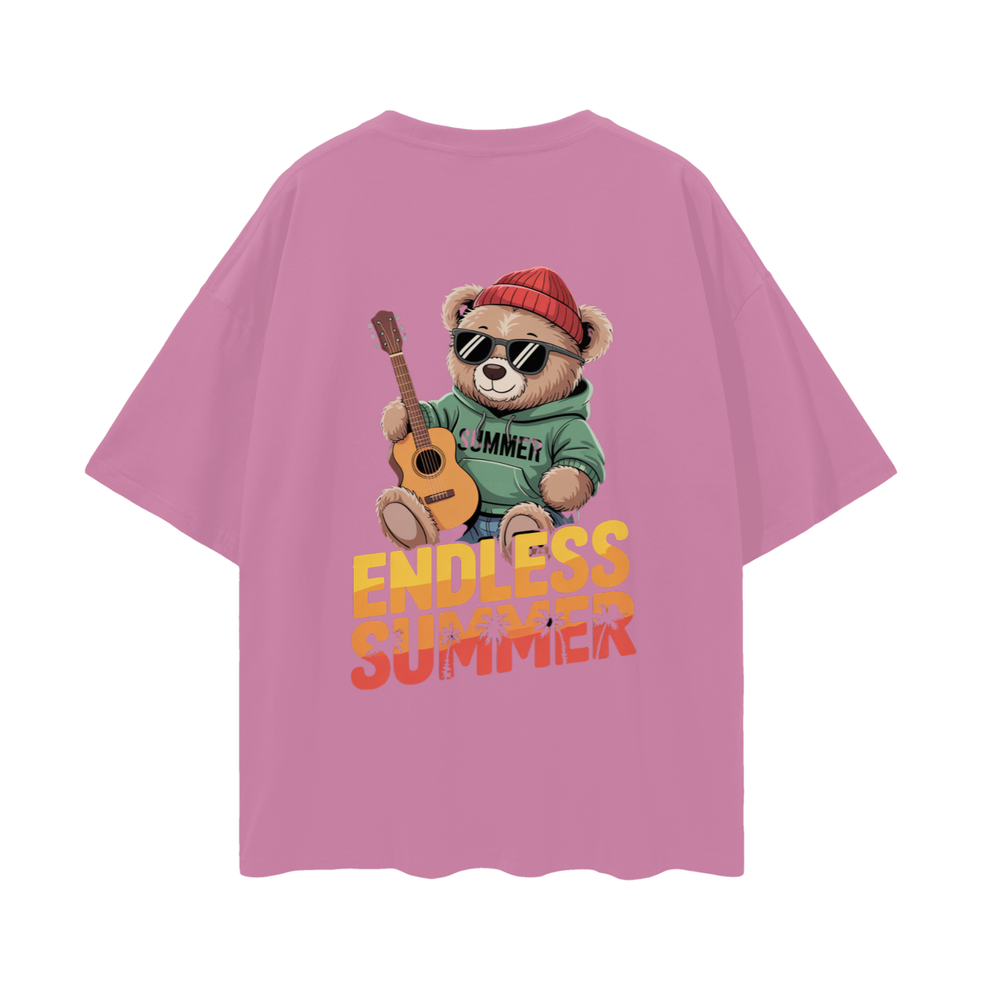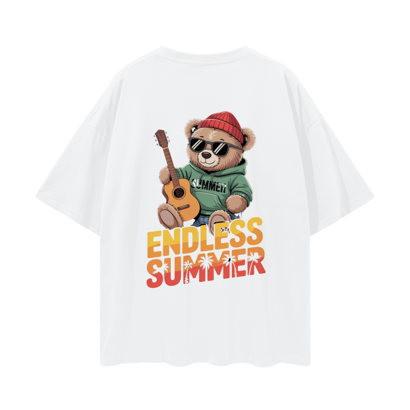 - Back Design: Vibrant print featuring a teddy bear with sunglasses, beanie, and guitar, along with “ENDLESS SUMMER” text and palm tree details. The word “SUMMER” is printed on the bear’s hoodie.