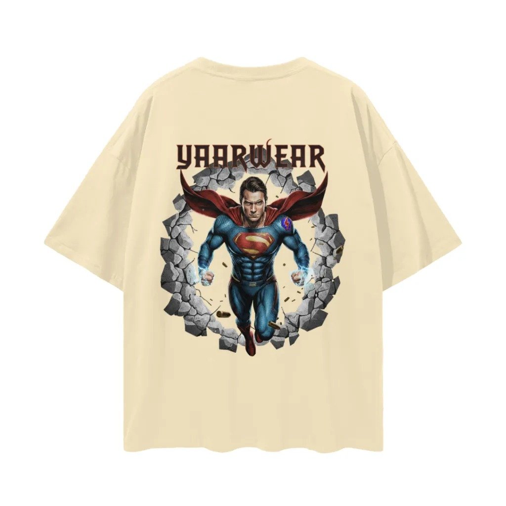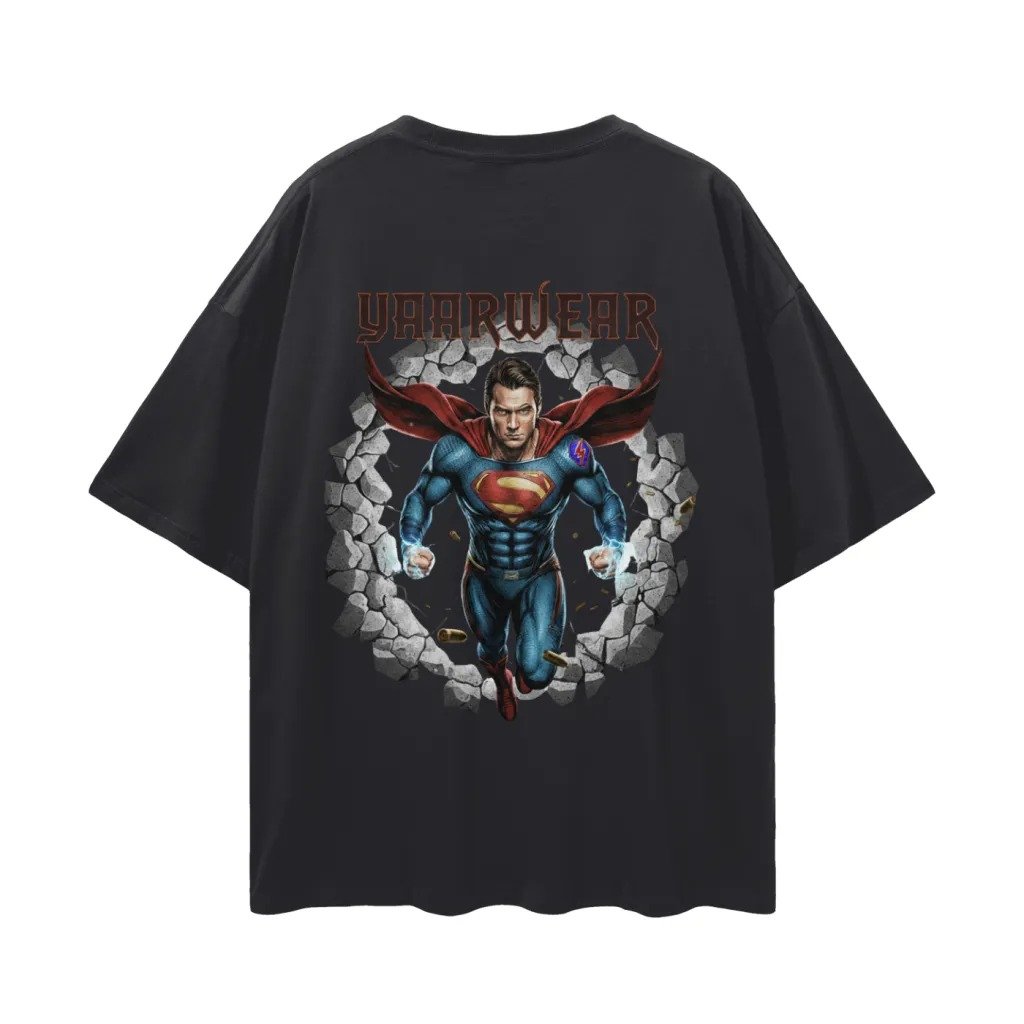 Unleash your inner hero with the YAARWEAR Superhero Graphic Oversized T-Shirt, a bold fusion of streetwear fashion and comic-inspired art. Designed for trendsetters, this premium cotton tee features a vibrant YAARWEAR logo print on the front and an action-packed superhero breaking-through graphic on the back, making it a true statement piece from every angle.